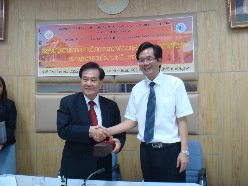 图为2009年9月,蔡袁强校长与时任东方大学校长Suchart Upatham签署《det365官网网站与泰国东方大学合作培养教育项目协议书》后握手共贺