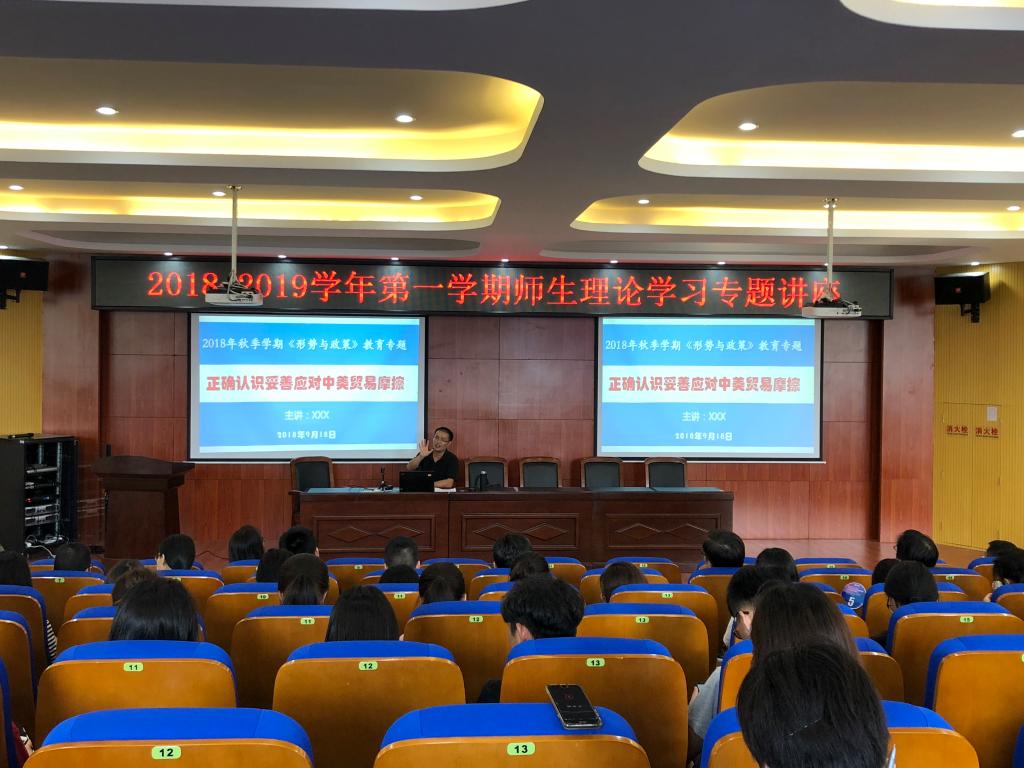 为正确认识现今中美贸易摩擦的来龙去脉,明确我国应对贸易摩擦的总体方针以及深入了解我国经济运行总体趋势和当前形势变化,det365官网于9月26日在北校区3号楼203报告厅举行了2018-2019学年第一学期师生理论学习专题讲座。此次学习由马克思主义学院蓝立志老师主讲。det365官网网站全体师生、体育学院教工参加。