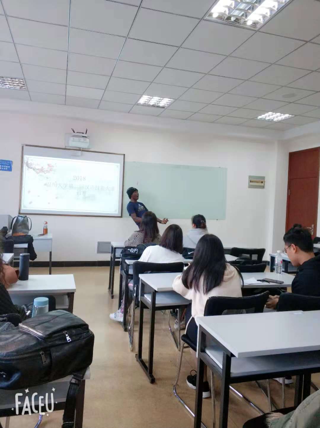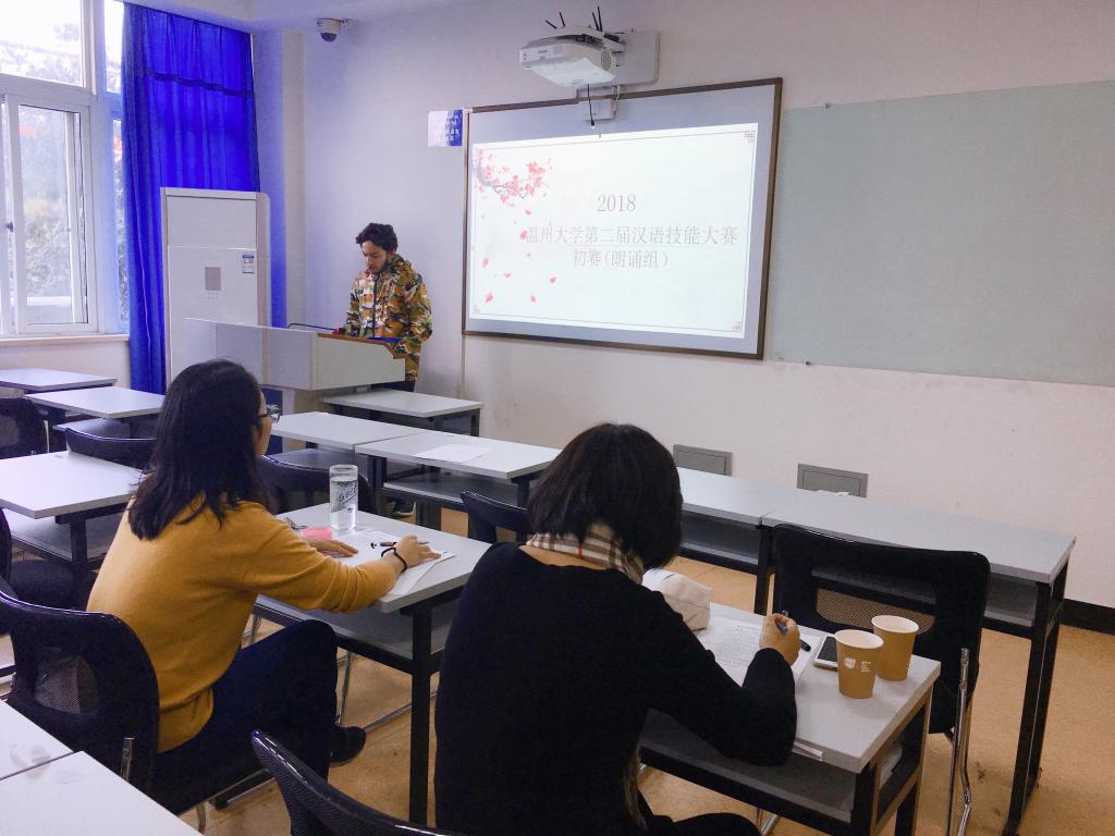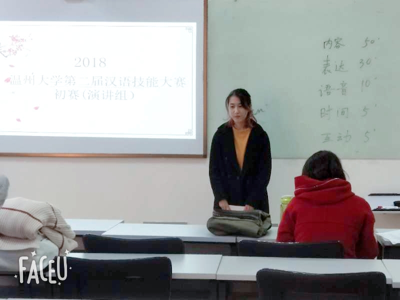 2018年11月26日下午3点半,我校第二届留学生汉语技能大赛初赛在det365官网网站举办,来自韩国、泰国、喀麦隆、意大利、乌干达、埃塞俄比亚等多个国家的留学生参加了本次比赛。本次比赛涵盖演讲、歌唱、朗诵三个类别,分别在不同的教室同时进行。为了确保本次大赛评比的公开、公平、公正性,本次比赛邀请了六位老师作为此次比赛的评委。其中郑婷和金碧两位老师为演讲组的评委,阚文文和徐丽丽两位老师为朗诵组的评委,包含丽和张珉璐两位老师为歌唱组的评委。在比赛开始之前,各位老师首先向学生细致讲解了本次比赛的基本要求和打分细则,并通过抽签的形式确定参赛选手的顺序。