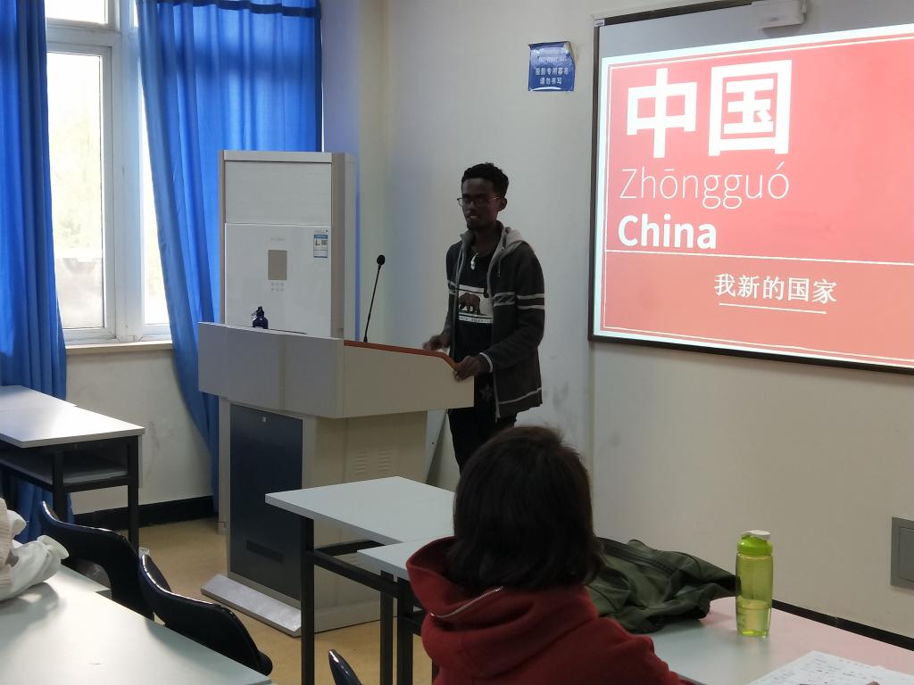 演讲比赛以“收获·中国”为主题,选手们绘声绘色地分享了他们在中国的收获,来自埃塞俄比亚的田阳明在演讲中分享了他对中国菜的理解和喜爱。