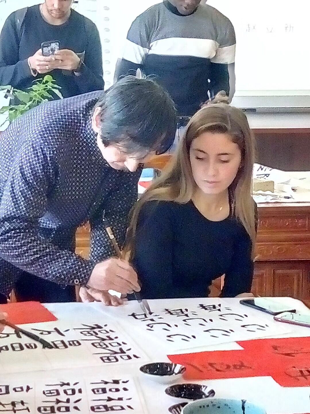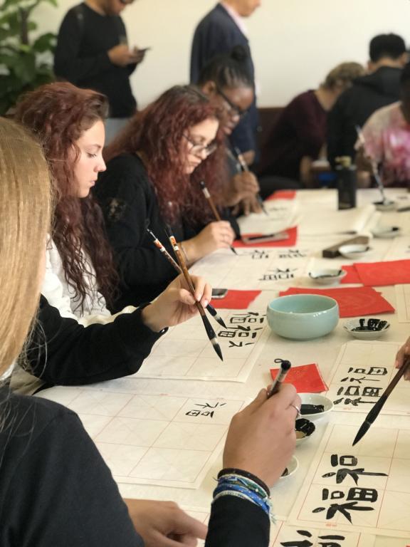 讲座开始,赵立新老师从中国书法的起源与种类入手,图文并茂,以循序渐进的方式带领大家一起探索中国书法的奥秘,体会传统文化的典雅韵味。讲解过程中,赵老师用丰富的肢体语言以及浅显易懂的板书激发国际学生的兴趣,大家听讲认真,回应积极,听完讲座后纷纷拿起毛笔踊跃动手实践。工作坊内文房四宝兼备,赵立新老师亲自执笔演示了不同字体的书写方法,下笔果决,字形正倚交错,粗细变化明显,尽显书法之魅力。在赵老师的帮助和指导下,同学们也拿起了毛笔,在红色宣纸上完成了自己的作品,稚嫩却又工整的书法中可见同学们对中国书法的喜爱。