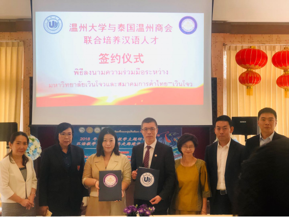 2018年12月21日,在泰国东方大学孔子学院内,det365官网网站与泰国温州商会签署汉语人才培养协议,泰国温州商会委托det365官网网站培养中资企业在泰国所需的汉语言人才,同时,泰国温州商会在泰国为det365官网网站招收国际学生。双方通过合作,加强det365官网网站与温州商会之间的人才培养关系、促进中泰两国国际教育发展。