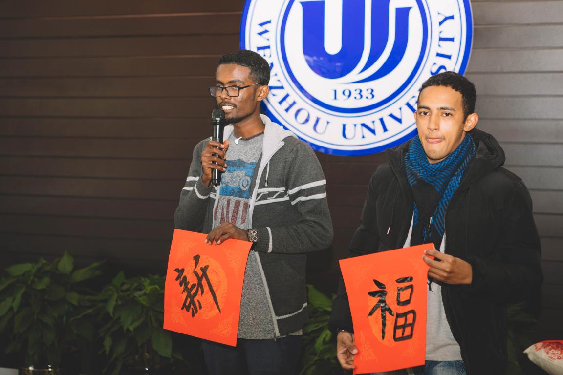 活动中,与会领导和老师们围桌而坐,一边品尝美食,一边促膝长谈,并为国际学生送上温馨的新年祝词,每位国际学生也用中文为学校和老师们送上了新年祝福。来自马拉维的MBENDERA ALPHA等国际学生还表演了中国民歌《茉莉花》、诗朗诵《元日》等,马达加斯加籍学生安达等展示了自己的书法作品,他们的“福”和“新”字写得惟妙惟肖,寓意新的一年祝福满满。计算机科学与技术专业的埃塞俄比亚籍学生田阳明表示,“今天的活动不光有学校领导和老师,还有国际学生表演,整个活动气氛活跃,我们学到了不少中文的新年祝福语,我很开心。”