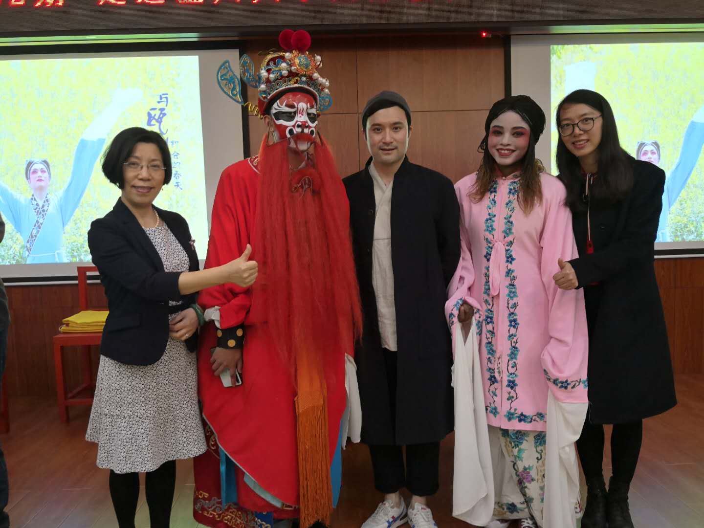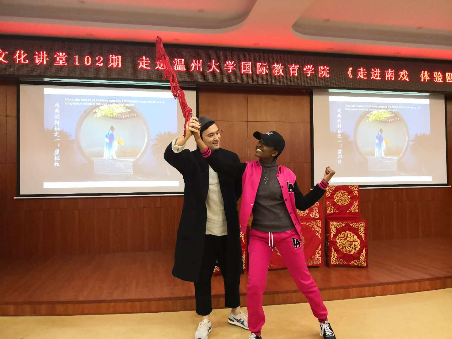 4月12日晚,讲座开始。方老师用他诙谐幽默的讲解、趣味十足的互动为来自五湖四海的留学生们开启了瓯剧艺术的第一次亲密接触。在这堂特殊的东方文化课上,方汝将老师通过演员们全副武装的扮相和婉转动听的唱腔让留学生们领略Wenzhou Opera的独特魅力,通过分解戏服和瓯剧表演程式把瓯剧艺术的基本知识轻松代入,通过“生、旦、净、末丑”五种行当的角色依次登场展现出瓯剧的活色生香,通过邀请留学生上台学“把式”和化全妆等形式打通了戏曲艺术的隐形国界。国际学生们听得津津入味,踊跃举手要求尝试瓯剧表演基本动作,并将“耍花枪”“舞袖”“起码”“转佛珠”等唱、念、做、打几项动作演绎得惟妙惟肖。讲座现场,不时爆发出雷鸣般的掌声。