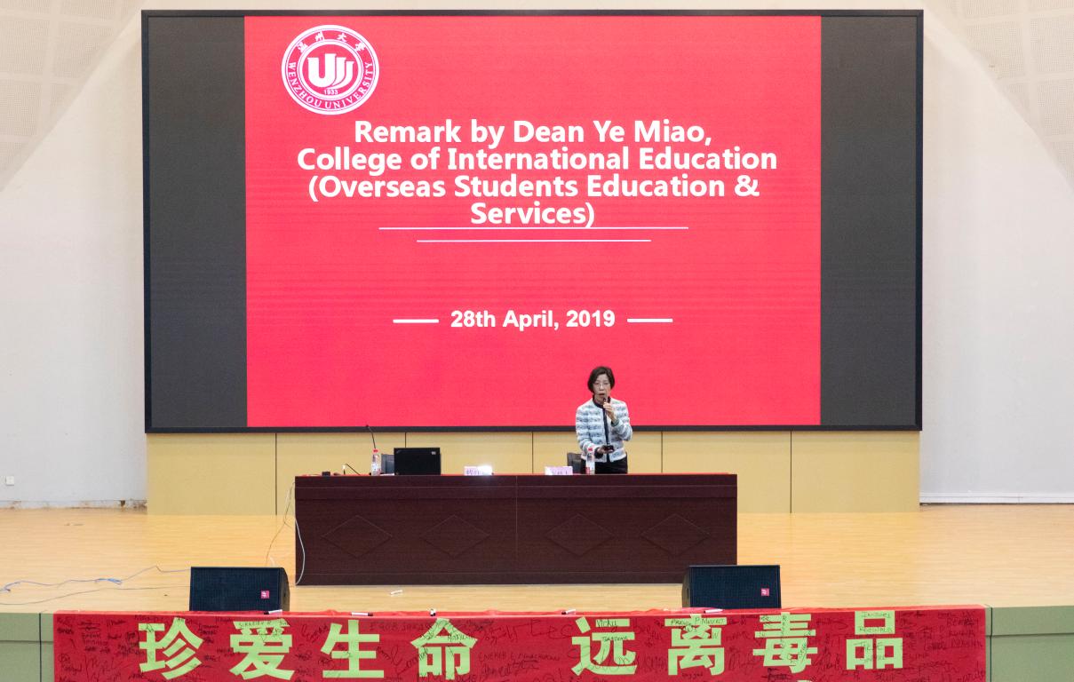 为了做好中国法律法规和校纪校规的宣传,将法律法规教育贯穿国际学生培养全过程,提高国际学生的法律法规意识,4月28日,我校在南校区9号楼一楼报告厅召开全体国际学生安全教育大会。党委委员、副校长钱强,茶山派出所副所长黄龙武、警官陈海敏,校保卫处处长孙安梭,后勤集团公司副总经理张雪萍,国际学院(留管部)院长兼党总支书记、主任叶苗,商学院党总支副书记刘开练、法政学院副院长缪心毫、数电学院副院长朱翔鸥、生环学院副院长陈华林、机电学院党总支副书记李密,专业学院国际部主任、专员、班主任、辅导员以及600多名国际学生参会。会议由国际学院党总支副书记陈文远主持。