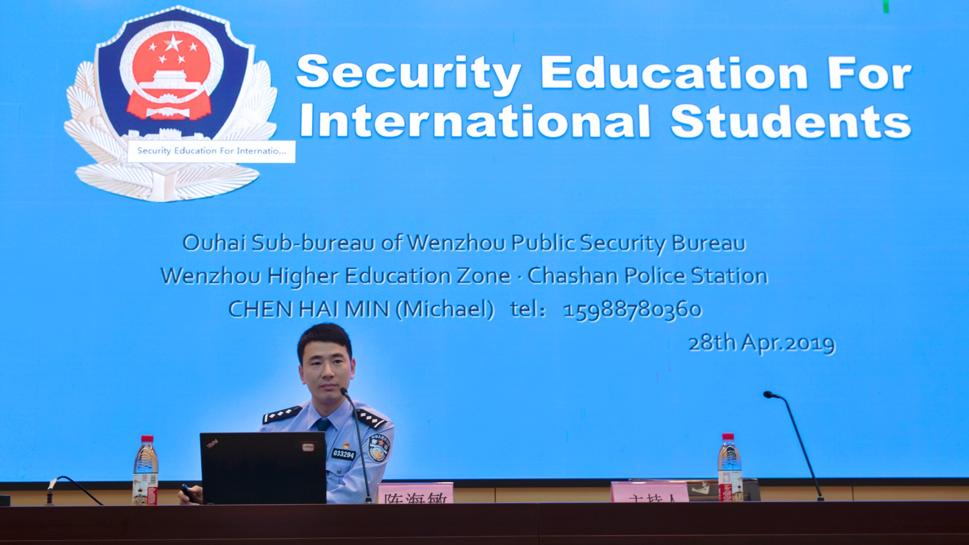 会上,陈海敏警官从紧急报警、防盗防诈骗、出入境管理、违禁物品管理、典型案例等五个方面强调了中国法律法规,并结合发生在国际学生身边的真实事件向他们宣传了安全防范常识。国际学院(留管部)辅导员钱江潮老师介绍了部门责任和分工、国际学生会(ISRC)的机构设置和成员,讲解了国际学生教学管理、校内外住宿管理、纪律处分规定、请假考勤制度和心理困惑帮扶渠道,结合正反面案例对非法就业、宗教活动、保险理赔、财物盗窃、网络诈骗等方面进行了警示教育,告知国际学生要遵守中国法律和校纪校规,学好中文和专业知识,做到专业学习和综合素质双提升,争做优秀国际生。他诙谐幽默、生动丰富的演讲赢得了在场师生的阵阵掌声,让国际学生在现场互动和交流中深化了对校纪校规的了解和理解。