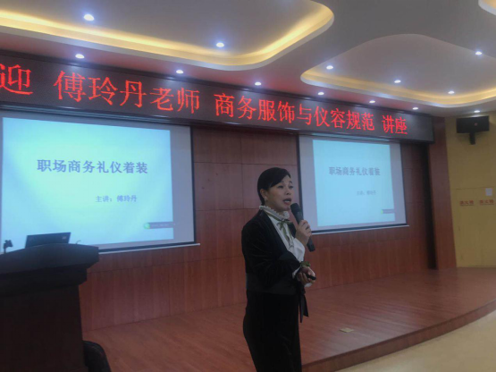 傅老师从社交礼仪、职场礼仪、餐桌礼仪等方面阐述了各种礼仪要求和礼仪禁忌;也分别从男士、女士角度介绍了不同要求的职场服饰礼仪。值得一提的是,傅老师提出了一些修饰身材的技巧,这对在座同学今后日常的穿着也颇具借鉴意义和指导价值。