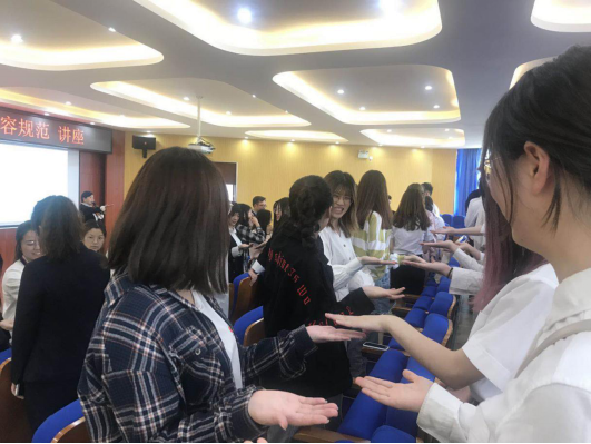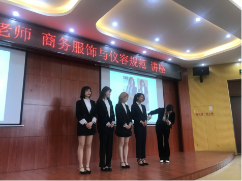期间,傅老师邀请了几位同学上台,以她们为例对其服饰进行点评,加深了我们对服饰礼仪注意要点的理解,也将我们纸上浅学融于社会实践中,以达到学习与聆听的真正意义。