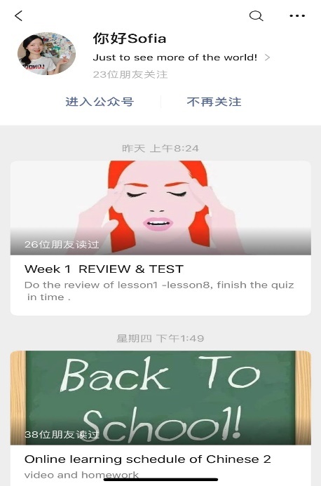 教师们采取录课和直播等多种方式,确保学生都能正常听课,并通过一对一或一对多的答疑互动确保教学质量。其中“汉语二”的3位教师,在采用录课教学的同时还开设了微信公众号,用于实时发布教学信息。