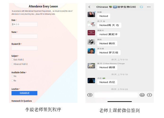我校共有学历国际学生600多人,为保障国际学生教学质量,任课教师们使尽浑身解数解决线上教学遇到的种种问题。例如,高等数学课程李毅老师,为学生们设计了签到小程序,可以自动获取学生地理位置,便于实时掌握学生的位置。除此之外,教师们还采用了符合国际学生使用习惯Zoom作为主要教学平台,结合微信作为签到、发放通知以及留言答疑的平台。