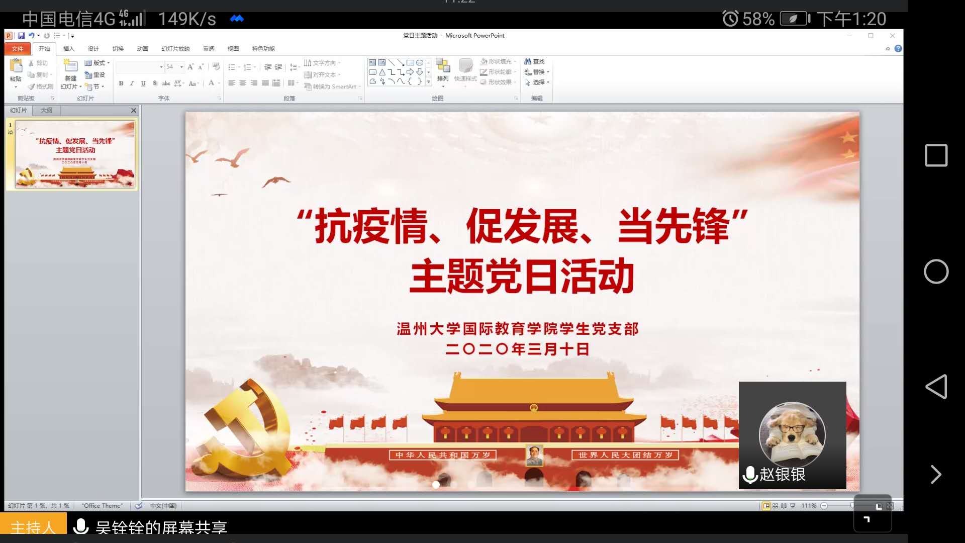 疫情之下,虽难以像往常一样面对面开展党日活动,但det365官网学生党支部也积极创新,采用线上视频会议形式开展了新学期的主题党日活动。支部全体学生党日如期参加活动,由学生党支部书记吴铨铨主持。