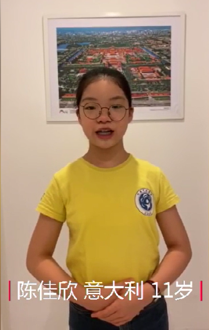 意大利营员代表陈佳欣很高兴能参加本次秋冬令营活动。她说这让他们这些生活在海外的华裔孩子们能够增进对中国的了解,牢记自已的根,自已的魂。她相信全体营员一定会以好学向上的态度来参加此次秋冬令营活动,大家一定也都会收获满满。