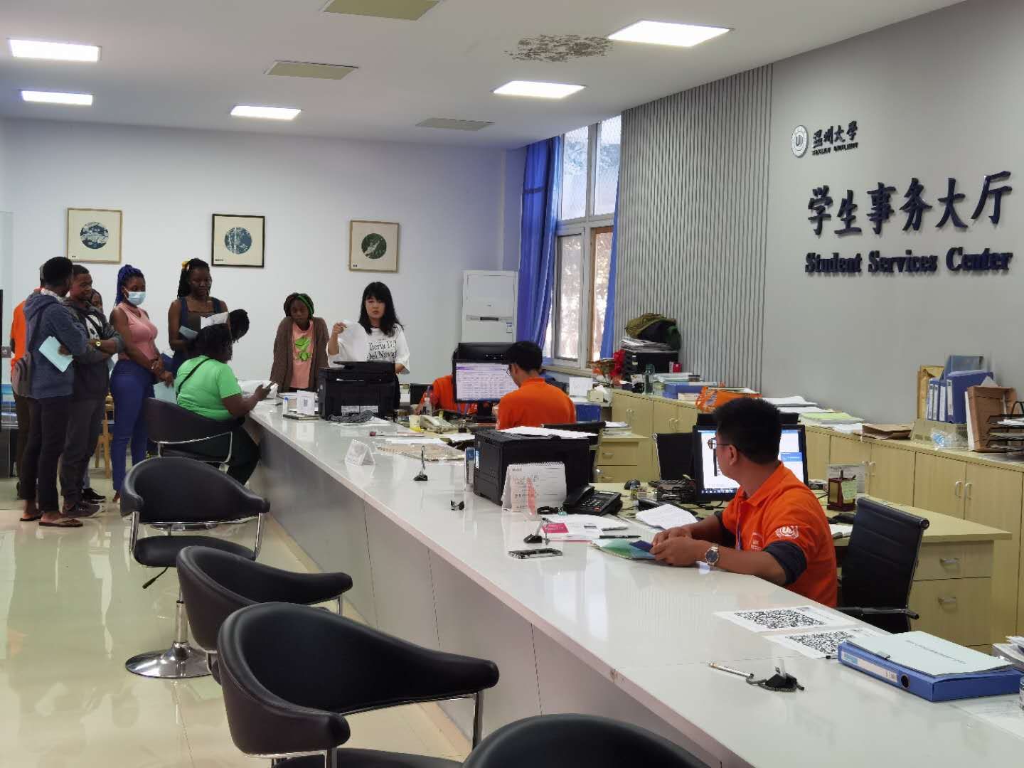 10月9日,我校迎来2020级留学生新生。北校3号国际楼一楼的报到注册大厅内,各位老师已准备就绪,提前确定好报到注册流程和迎新资料,等待新一届留学生的来临。受新冠疫情的影响,尚有20多位留学生在中国境外不能前来报到,但是这丝毫没有影响各位老师的热情,不仅换上统一的迎新服装,还为新生们准备了学生手册、校园地图、学生风采、笔记本、笔、定制T恤等迎新“大礼包”,并贴心地为他们送上校园指南,指导下一步的注册流程。
