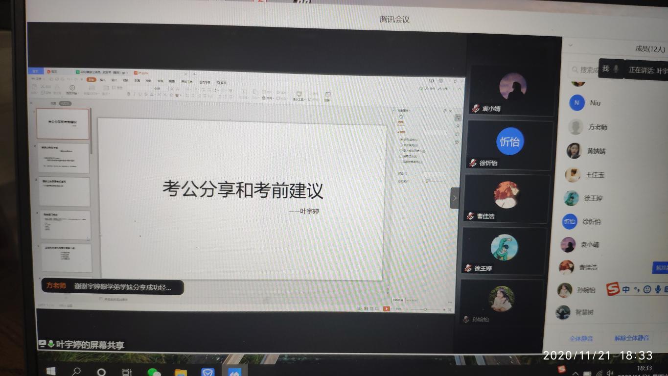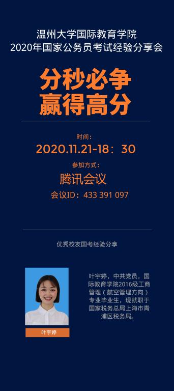 2020年11月21日晚,det365官网于线上召开了公务员考试经验分享交流会。会议邀请到det365官网优秀校友,现就职于国家税务总局上海市青浦区税务局的叶宇婷作为分享嘉宾,学院党总支副书记方建晓参加了会议。本次分享会由学工办辅导员吴铨铨主持。