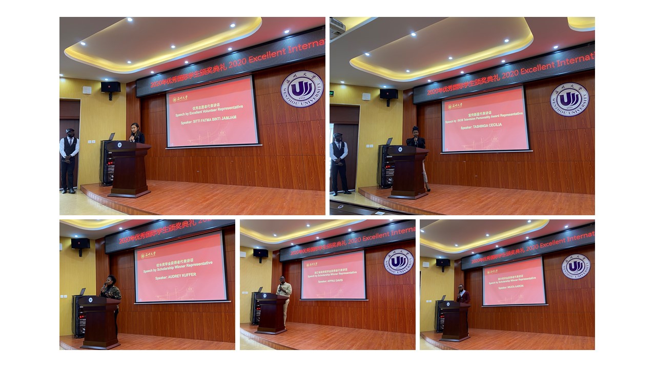 此次颁奖典礼设立了两个特殊的奖项:优秀国际学生志愿者和宣传新星奖。受新冠疫情影响,我校国际学生公寓采取封闭式管理,期间涌现了一批国际学生志愿者,他们在寒暑假期间坚持每天走访负责的宿舍,为每位国际学生登记健康码、检测体温并做好记录与汇报工作,他们的奉献精神影响了国际学生社区的其他同学,也为我校抗疫工作做出了不可忽视的贡献。宣传新星奖为det365官网新成立的国际学生电视台设立,他们活跃在校园各处,发掘校园新闻,不仅仅为在校学生传递信息,更为在国外的学生带去学校的温暖,拉近了我校与境外学生的距离。优秀国际学生志愿者代表SITTI FATMA BINTI JAMJAM和宣传新星奖代表TASHINGA CECILIA分别发言,他们分享自己的工作经验和感想,引起台下师生共鸣,众多国际学生受到鼓舞。