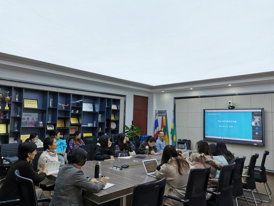 董建交教授从韩国的历史出发,介绍了韩国各个历史发展阶段与中国在政治、经济和文化等方面的交流,用历史事件、使臣出使、历史语料、传记和专著等对中韩两国来往密切性加以说明,并从韩语固有词中的上古汉语借词、汉语汉字词与汉语的联系、朝鲜李朝时期的汉语学习和中国古人记录的朝鲜语等方面详细讲解了历史上的中韩语言交流。董教授表示,韩语里广泛使用的中国汉字词和古汉语发音也反映了两国的文化交流的密切性,对两国人民学习对方语言起到了正向迁移的作用,我们在进行对外汉语教授的过程中,要多利用这种正向迁移,以便起到更好的教学作用。