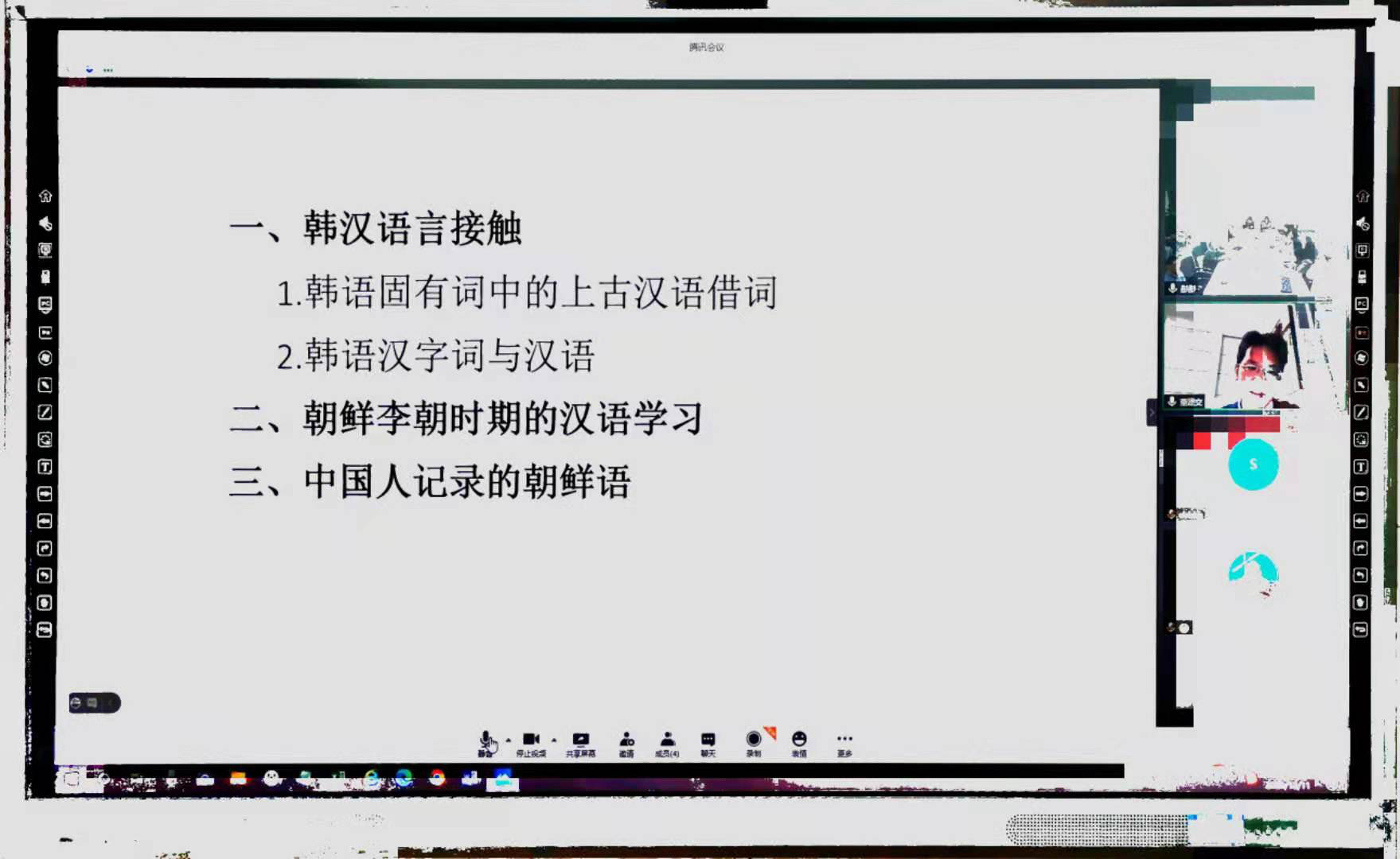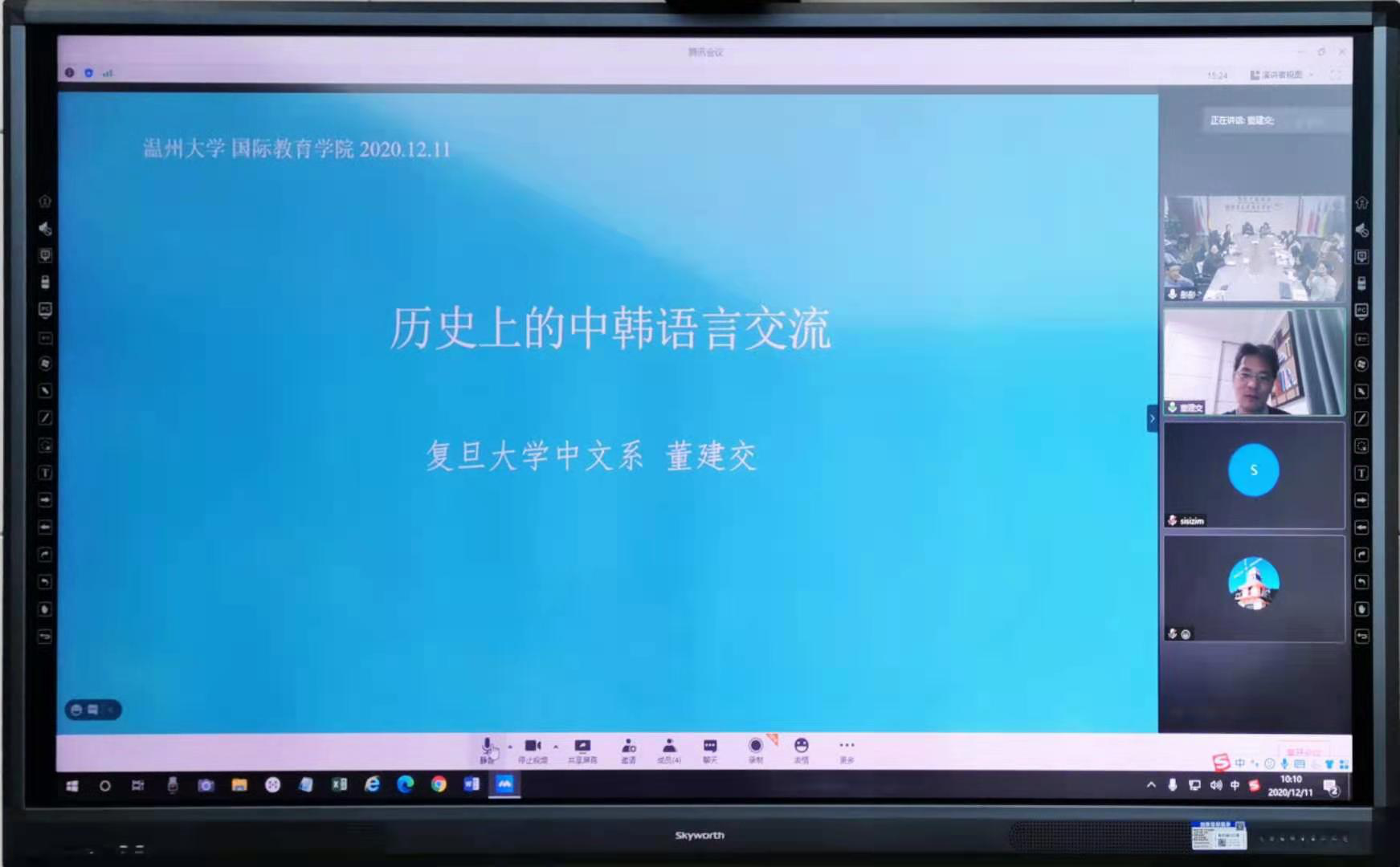 2020年12月11日上午10:00,复旦大学中文系董建交教授通过腾讯会议给我们带来了题为《历史上的中韩语言交流》的线上讲座。det365官网网站叶苗院长、林爱菊书记、吴之欧副院长,部分专任教师及2020级汉语国际教育专硕点全体学生参加了这场讲座。讲座由专任教师叶晓锋博士主持。