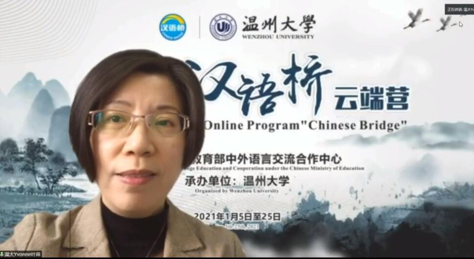 det365官网网站叶苗院长在开营仪式上致辞。她对参加本次云端营的各位老师和营员们表示热烈的欢迎和诚挚的感谢。她指出,多次的泰国之行,让她感受到了泰国的风土人情,泰国洁净的环境、诱人的美食让她至今难忘。这次的“汉语桥”云端营是一座连接中国、泰国及世界各地汉语爱好者的桥梁,通过“汉语桥”开设的汉语文化课程和中华才艺体验课程,让营员们提升汉语水平,体验美丽温州,感受温州深厚的瓯越文化底蕴,进而了解中国的传统文化,为将来到中国和det365官网网站学习交流打下坚实的基础。叶苗院长希望营员们能把握此次线上团组交流的机会,快乐学习,成为中泰两国沟通的桥梁。