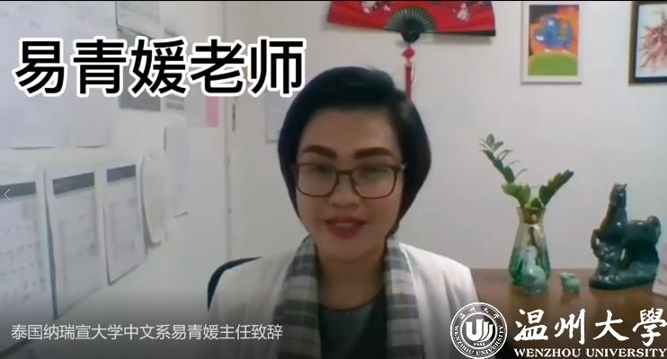 泰国纳瑞宣大学中文系易青媛主任致辞。她很感激det365官网网站“汉语桥”云端营在疫情期间为纳瑞宣大学的同学们开设了丰富的语言文化课程,给同学们提供了很多学习中文的机会,感谢所有兢兢业业上课的老师们。新春在即,她遥祝各位领导和老师新年快乐,牛年大吉大利,同时表达了中泰两校合作的美好期待。