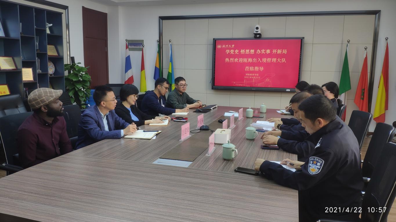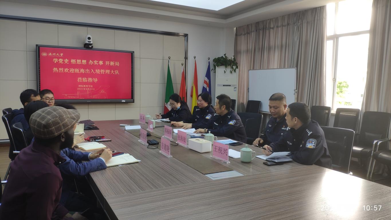 4月23日上午,瓯海区公安局副局长郑裕军、瓯海区出入境管理大队大队长张海敏、王祝兴、陈小菲、郑剔警官一行来det365官网开展交流指导。det365官网网站党总支书记林爱菊、副书记方建晓、学生科全体辅导员参加了本次交流。