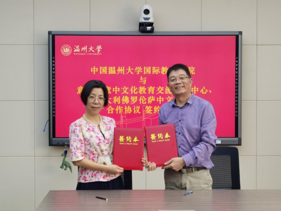 潘世立校长详细介绍了意大利佛罗伦萨中文学校的基本情况、当前全球疫情影响下的教学形式,以及接下来一年的教学工作安排。他还提出了对此次合作项目及参与师生的一些希望和要求,同时也表达了对温大学子及教学质量的信任。最后,双方签订合作协议并交换协议书。