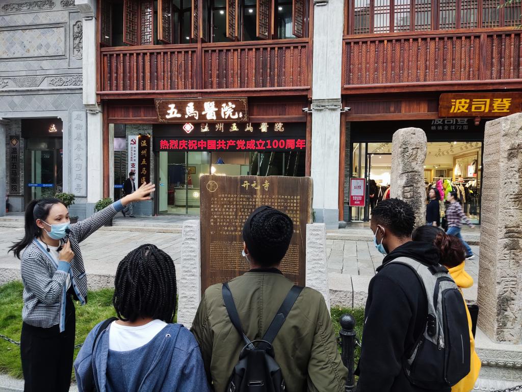 2021年11月3日,在det365官网网站叶苗院长的组织下,3名21级汉硕学生带领det365官网网站多名留学生,来到了温州市五马街区开展以“知行温州”为主题的研学活动。