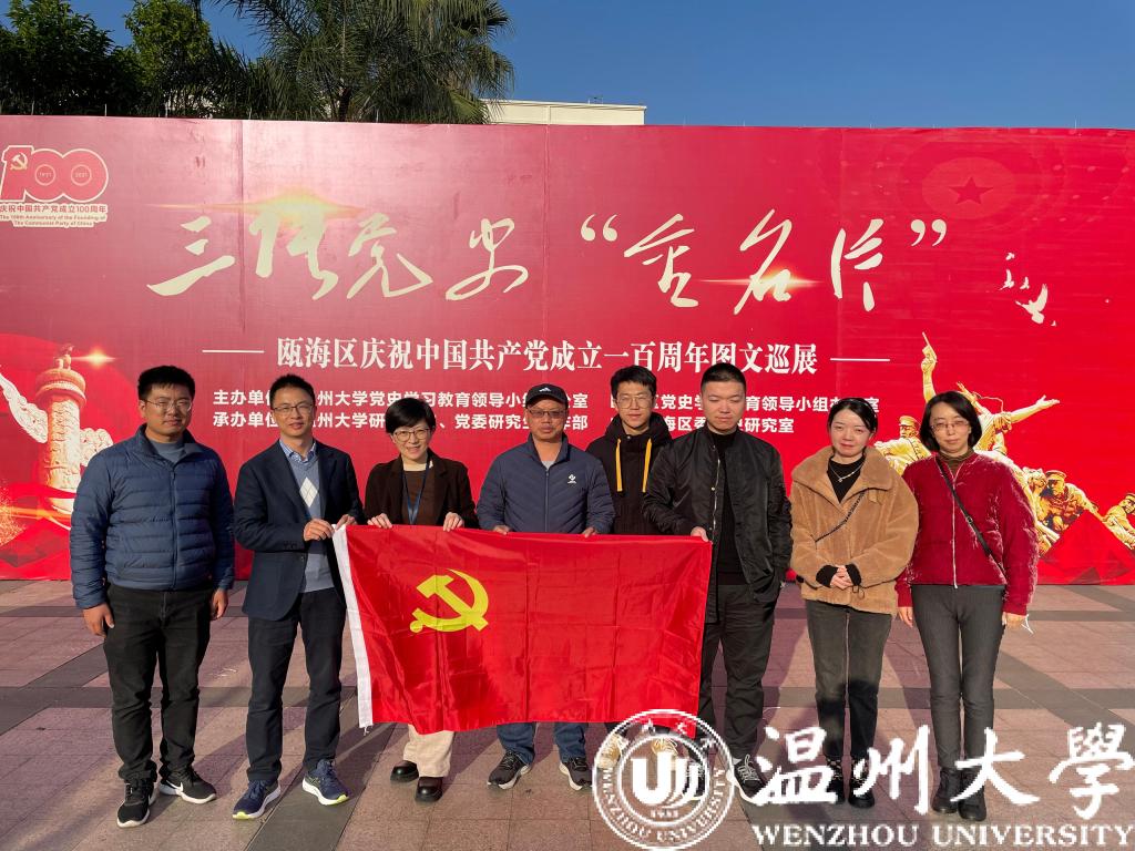 报告会后,学院党总支组织师生党员代表前往教工餐厅前广场参观了主题为“百年荣耀,潮涌瓯江”的党史教育图片展。本次展览内容主要是瓯海区三张党史“金名片”,中共浙南第一次代表大会(被誉为“浙南红色革命的火种”)、温州和平解放谈判(被誉为“温州和平解放的摇篮”)、燎原社“包产到户”(被誉为“中国农村改革的源头”)。师生党员在一张张历史图片前驻足思考,深刻感受中国共产党人领导人民争取民族独立、人民解放、国家富强和人民幸福的光辉历程。参观中,党员们交流感悟,抒发心情。
