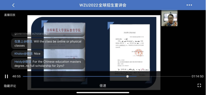 12月23日下午,由留管部组织的“WZU2022全球招生宣讲会”在企业微信线上会议室顺利举行,直播现场设在北校区3号楼det365官网网站311会议室。