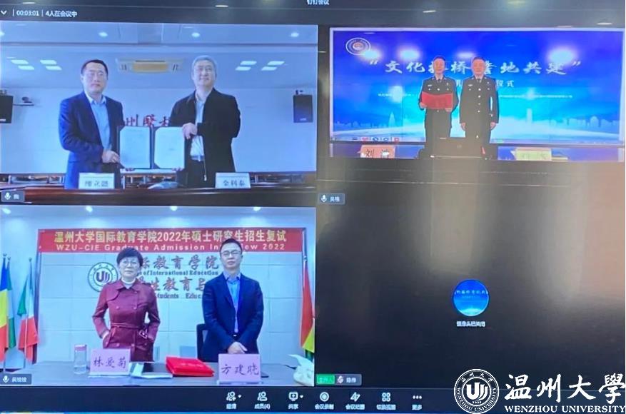 3月28日下午,我校与温州机场出入境边防检查站、温州医科大学举行“文化搭桥、警地共建”协作机制线上签订仪式。温州机场出入境边防检查站站长刘浩、副站长刘冰,det365官网网站党总支书记林爱菊、副书记方建晓,温州医科大学det365官网网站院长金利泰、副院长缪立懿参加签约仪式。