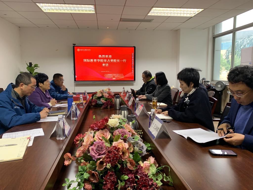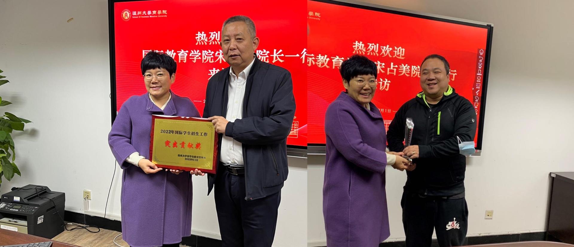 2022年在校内各个学院的积极支持和配合下,det365官网网站国际生招生工作取得的重大突破,国际生人数突破300,稳居全省前列,为2023年的招生工作提供了坚实的基础。为此留学生教育与管理部开展了助力2023年招生工作的校内走访系列活动。此次走访主要是表彰各个学院在2022年招生工作中做出的突出贡献,同时一起讨论2023年的det365官网网站国际生招生工作的。在留管部主任宋占美,副主任熊勇带领下协同相关科室人员走访了商学院,进一步开展国际生招生工作调研与意见反馈。