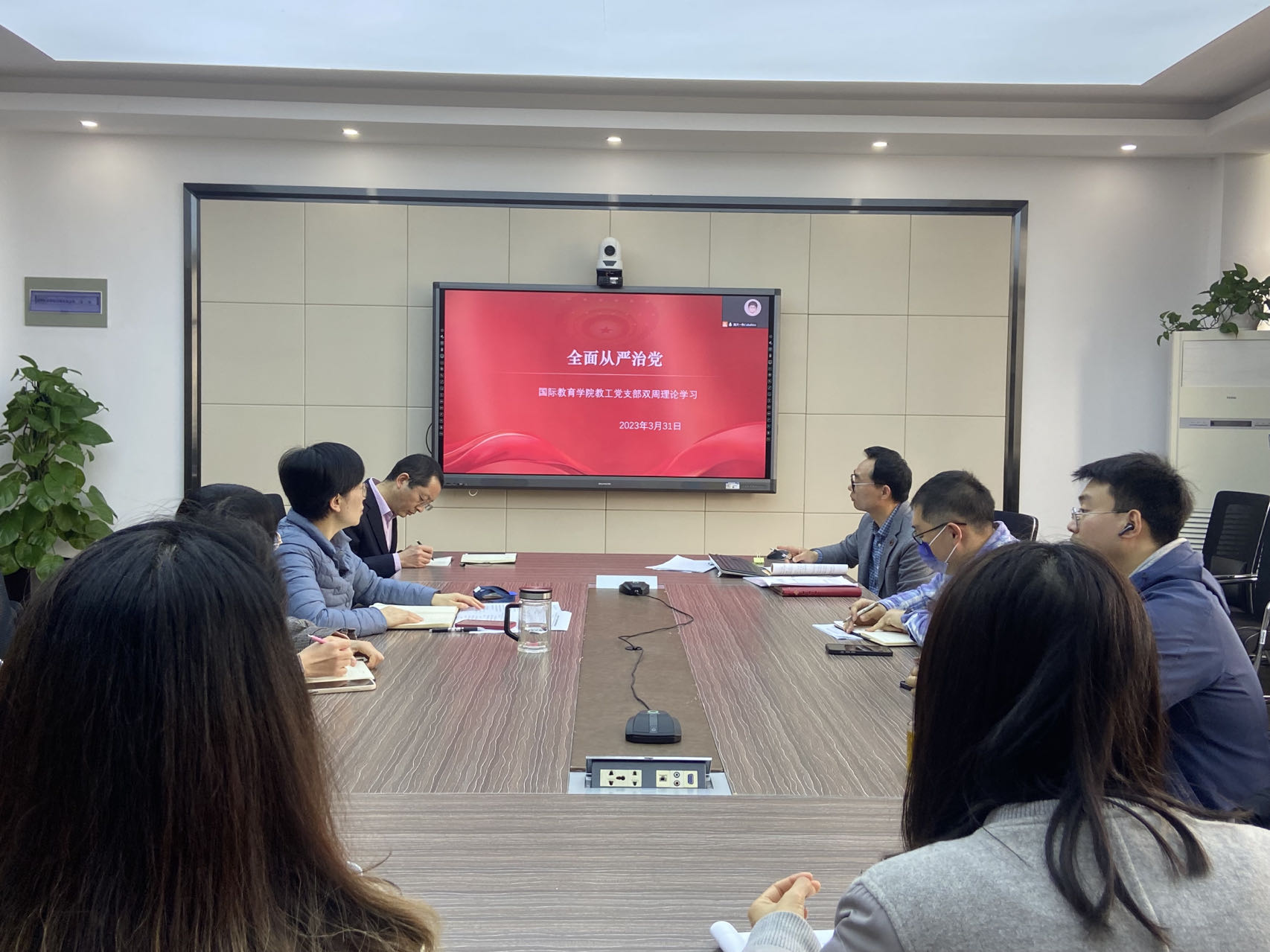 3月31日下午,det365官网网站全体教师在国际楼311会议室召开师生政治理论学习会,det365官网网站教工第一党支部书记涂海强博士作“全面从严治党”的专题讲座,党总支书记林爱菊主持。