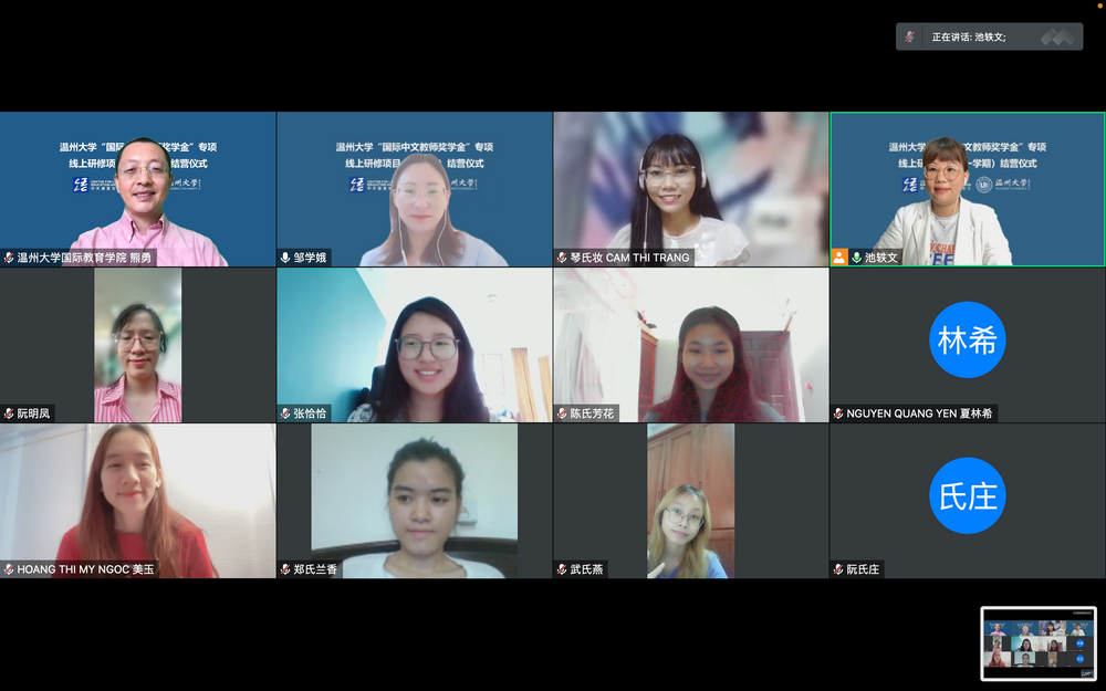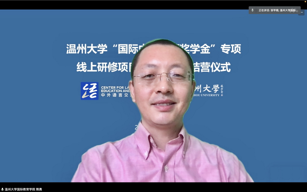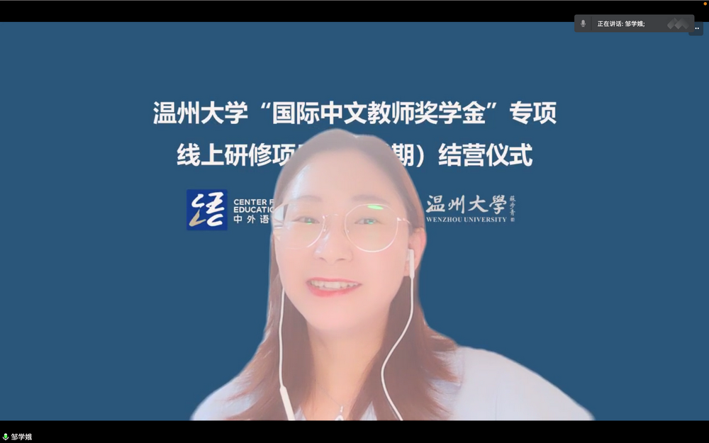 然后,由det365官网网站教师代表邹学娥老师讲话。她对全体学员表示祝贺和感谢,认为本次线上学习营的圆满成功离不开教师和学生之间的相互支持,深感教学过程中见证了学生们对学习汉语的热情和坚持,教师们也为此深受感动,并将这份感动化为教学中的热情与耐心。最后,她期待大家能来中国留学,能来det365官网网站看看。