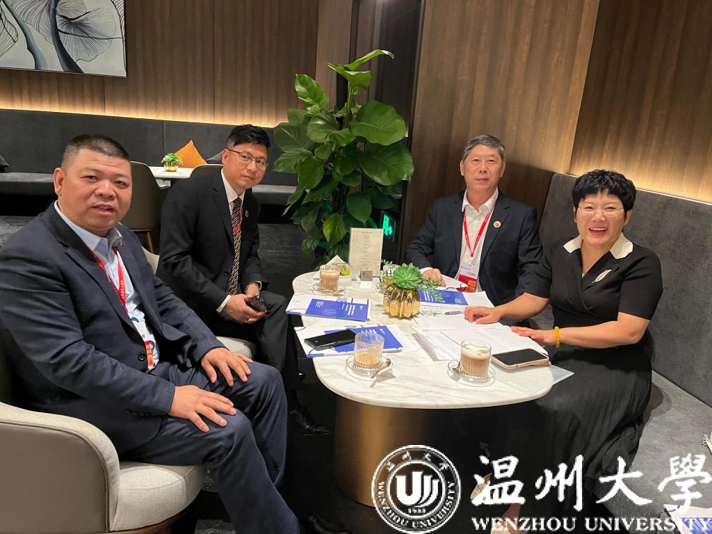 2023年10月14日,世界温州人大会在温州隆重举行。会议间隙,坦桑尼亚浙江商会会长夏赵春、秘鲁浙江总商会执行会长张建英、越南中国商会浙江企业联合会会长缪仁赖、印度尼西亚浙江总商会会长伍晋斌受邀与学院院长宋占美举行合作洽谈交流,det365官网网站招生科副科长吴铨铨参与交流。