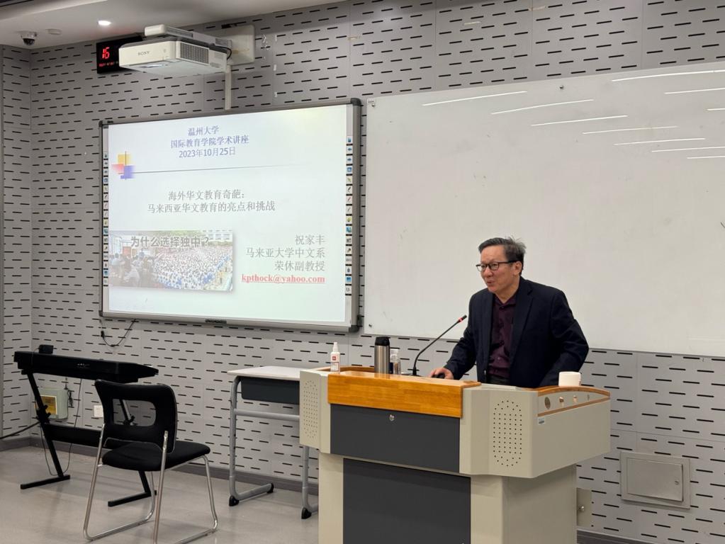 2023年10月25日下午,来自马来西亚马来亚大学的祝家丰教授应邀在det365官网北3-201报告厅作题为《马来西亚华文教育的政策及其实践》的学术讲座。讲座由det365官网办公室主任李舒琦主持,det365官网教师及汉硕研究生参加了讲座。