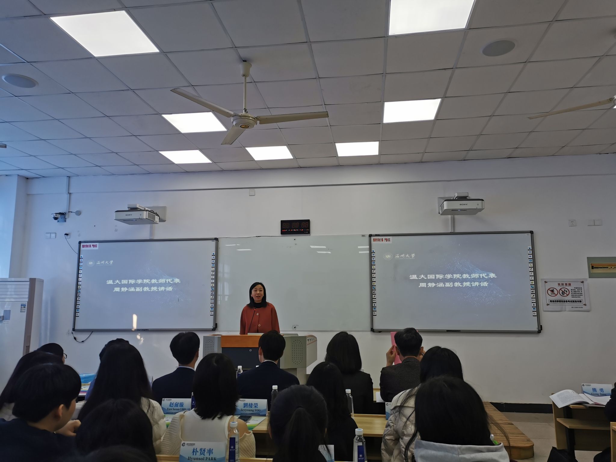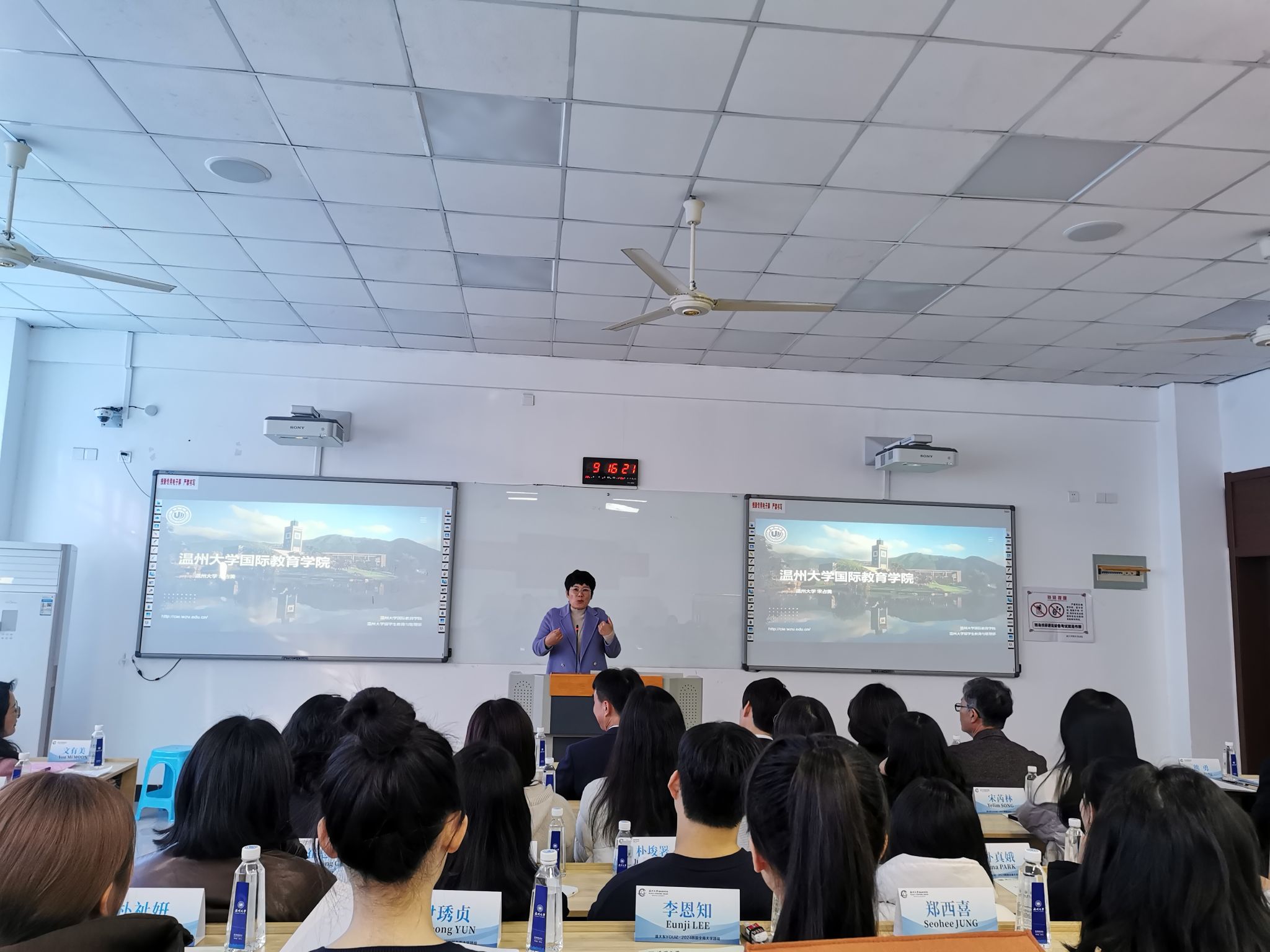 宋占美院长向来访的嘉宾和学生介绍了温大det365官网网站的办学情况,向韩国学生展示了我校留学生在温大学习、生活的阳光的风貌。她表示,学院为本次活动做了精心的安排,希望能为这31名全南大学中文系的学生提供一次知行合一、近距离接触中国,探索中国文化的机会。