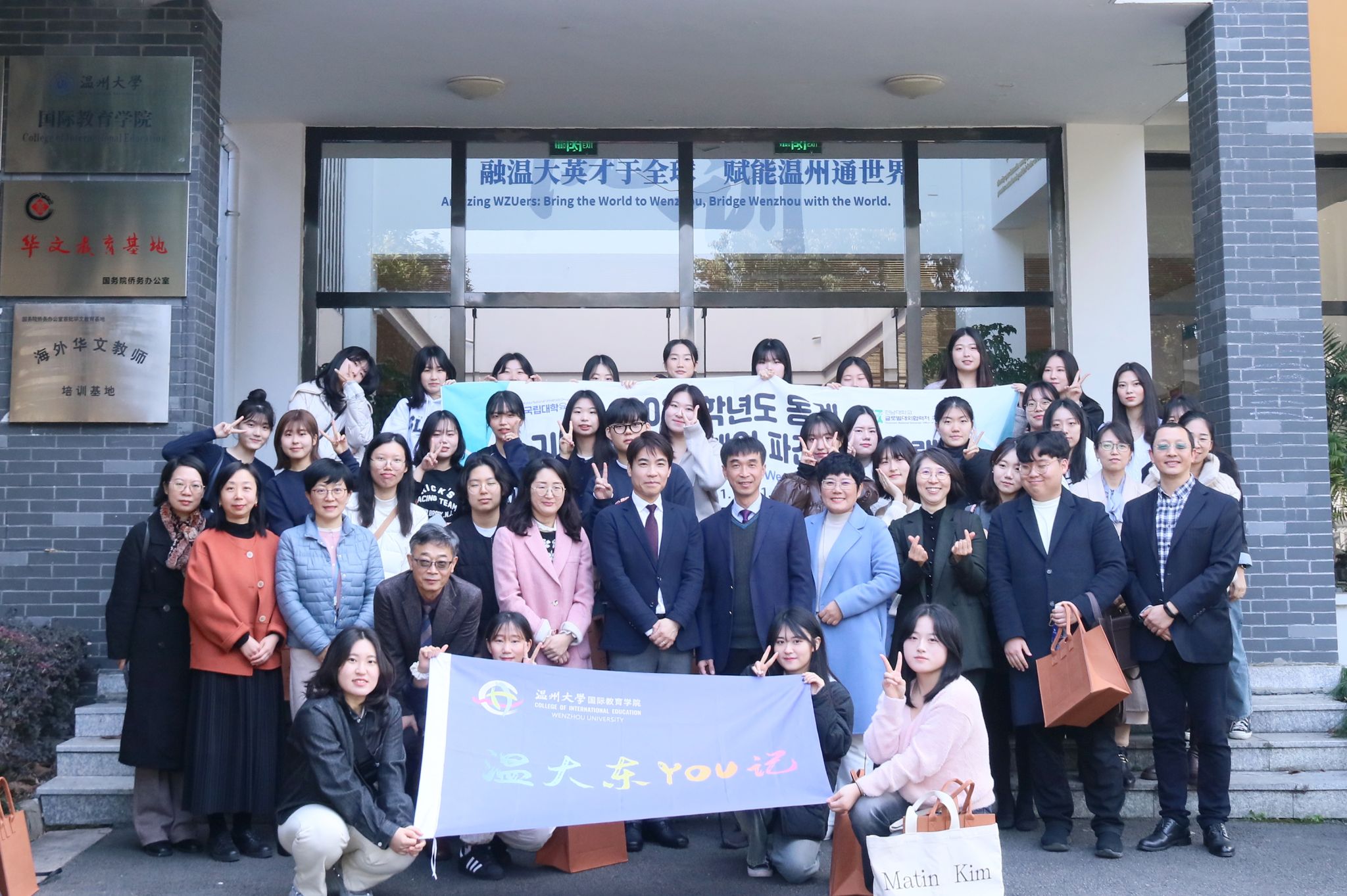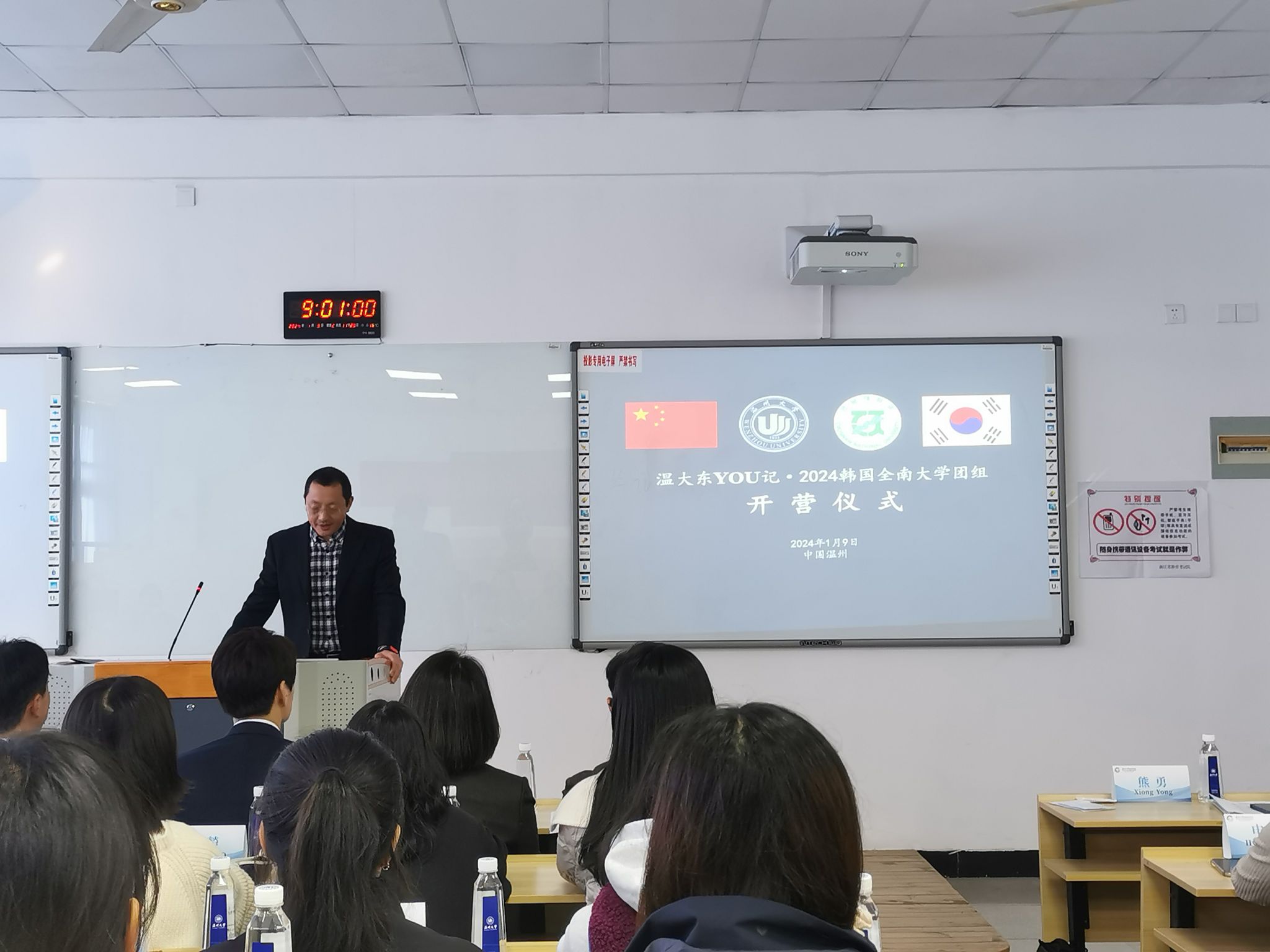2024年1月9日上午,温大东YOU记·2024韩国全南大学团组开营仪式在det365官网网站顺利举行。本次团组由31名来自韩国全南大学中文系的学生组成,将在温大进行为期2周的汉语言培训和文化体验活动。韩国全南大学国际处处长尹玄植、中文系主任文有美、教授金泰完、副教授李喜卿;det365官网网站国际处处长黄文浩、det365官网网站院长宋占美、书记林爱菊、副院长熊勇、以及本次团组授课教师周静涵副教授和相关工作人员出席了开营仪式。开营仪式由温大det365官网网站副院长熊勇主持。