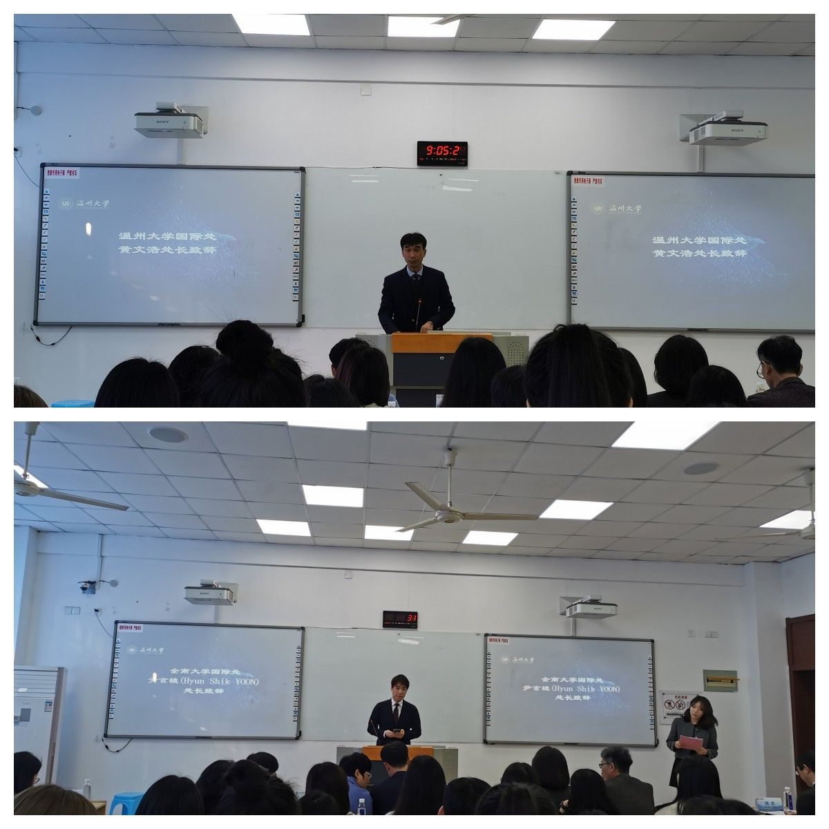 黄文浩处长和尹玄植处长先后致辞,双方均表示全南大学与det365官网网站的合作渊源已久,双方师生互动交流日益频繁,持续向深层次宽领域拓展,希望借助本次团组的开展能够开辟两校合作的新领域、新途径,并表达了对此次活动成功举办的期许。