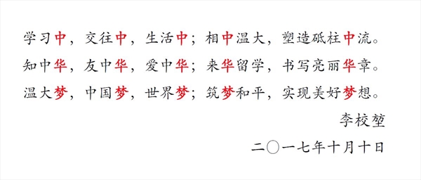 歌词起草和定稿过程中,得到学校国际化工作的积极倡议者校长李校堃教授的悉心指导,他亲自为新歌发布题序,激励留学生努力学习,实现理想。留学生有了属于自己的歌曲,学歌曲也是学中文,和中国学生一起演唱还能交朋友,既丰富了精神文化活动,又提高了词汇与语感水平,对于留学生提高跨文化交际水平与跨文化适应能力不无裨益。“唯以心相交,方能成其久远。”当越来越多的外国留学生把中国当成自己的第二故乡来爱护,把“一带一路”当作自家的路来支持维护,当越来越多的外国民众把身边的中国人当好朋友好伙伴,“一带一路”也必然将行稳致远,我们的“中国梦”也终能梦想成真。