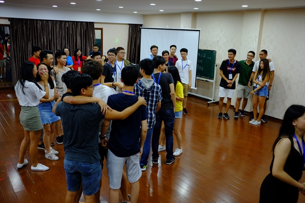 接下来就是今晚的重头戏了——破冰!助教徐一晴、徐一凯老师为此也设计了十分有趣的分组方案。在一晴老师的指导下,大家围成一个圈,进行“爱的抱抱”游戏。营员们随着音乐绕圈舞动,在此过程中,一晴老师会随机爆出一个数字,大家将按照这个数字与相应数量的同学拥抱在一起,落单则被淘汰。大家在音乐和笑声的感染下,都逐渐放开自我,积极参与。最终,在一次次拥抱下,5位成员顺利胜出,成为组长!