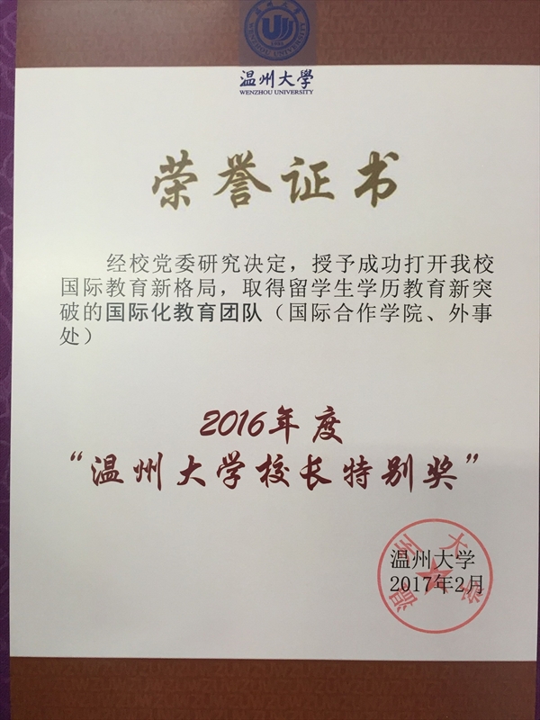 2017年2月19日,在茶山育英大礼堂召开了det365官网网站新学期全校教职工大会。会上,学校授予成功打开我校国际教育新格局,取得留学生学历教育新突破的国际化教育团队——国际合作学院和外事处“det365官网网站2016年度‘det365官网网站校长特别奖’”。