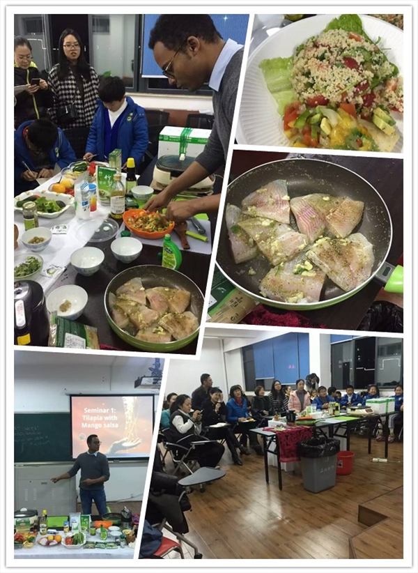 Eli老师将通过三次课来向学员们讲解西餐美食的特色及主要调料,并现场亲自示范几道经典西式料理的烹饪方法。昨晚的第一餐是Tacos 。从制作merinade fish(腌制新鲜鱼)、make couscous(制作库斯库斯米)、make mango salsa(制作芒果调味汁)到cook fish(烹饪鱼),再到拼盘完成,每一道工序都精益求精,让学员们不仅大饱眼福,也大饱口福。Eli老师还跟大家分享他的料理理念,“To me cooking is and hasalways been not only a hobby but a passion, cooking is a four dimensional art.Not only does it appeal to the visual, but it has the ability to go beyond thesenses and take a person to another place and time if only for a moment.”(对我来说,料理不仅是爱好,一种激情,更是一种四维的艺术。它不仅吸引视觉,超越感官,而且它还有能力在某个时刻带你去一个更好的地方。)