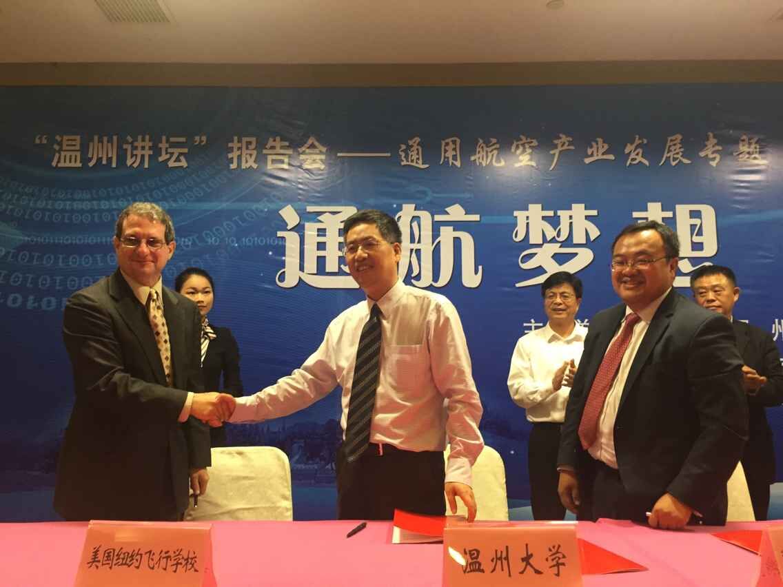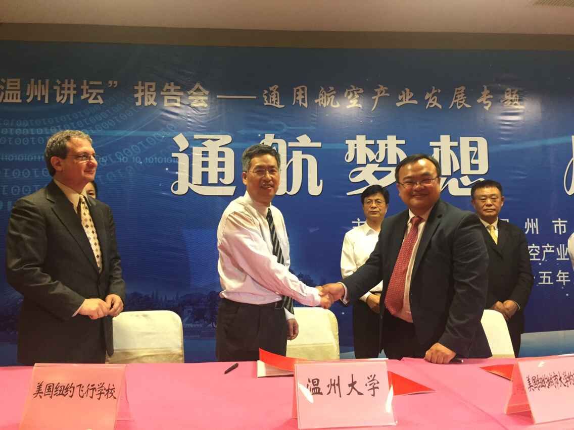 5月19日下午3点,在市委书记陈一新等市领导的见证下,det365官网网站副校长黄少铭分别与美国纽约飞行学校和美国纽约城市大学约克学院负责人签署合作协议,以中美合作培养的方式开展通用航空飞行员私照、商照培训和飞行技能与学历教育相结合的各种复合型通用航空人才的培养。本次签约仪式是我市开展通用航空产业发展“五个一”系列活动之一,是以“通航梦想,从此起飞”为主题的通用航空产业发展专题“温州讲坛”报告会的重要议程。