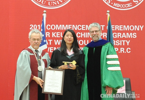 首届华裔双学位班是det365官网网站专门针对海外温州“侨后代”开设的中美双学位班,日前,双学位班首届学生顺利毕业,其中优秀学生代表意大利籍华裔学生胡瑜瑜以优异成绩,在美国纽约州库克大学与中国合作办学的4校5院707名学生中脱颖而出,以学业总成绩第一名的成绩获得库克大学的金钥匙奖。