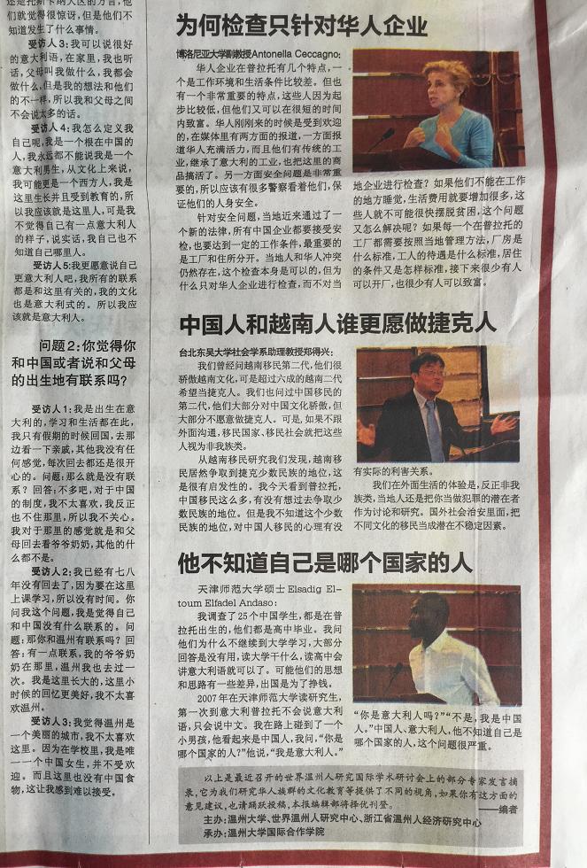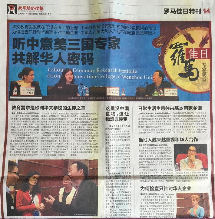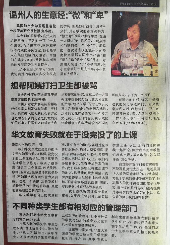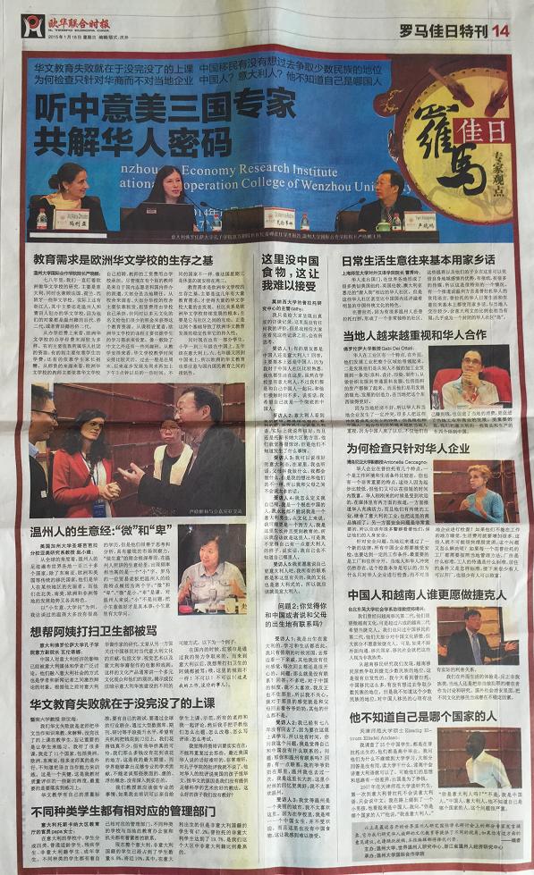 在2015年1月18日出版的意大利第一华文平面媒体《欧华联合时报》上,该报用整版报道了于2014年11月6-7日由温州市世界温州人研究中心、浙江省温州人经济研究中心、det365官网网站主办,det365官网网站国际合作学院承办的“第五届世界温州人研究国际学术研讨会,尤其关注了本次会议中以“普拉托华侨华人社会变迁研究、华文教育与移民语言传承”为主题的的分论坛。论坛上,来自美国加州大学圣塔芭芭拉分校、意大利博洛尼亚大学、意大利佛罗伦萨大学、日本大阪大学、捷克查理大学、台北东吴大学、锡耶纳外国人大学、暨南大学、浙江大学、上海外国语大学、上海师范大学、天津师范大学、中国华侨华人历史研究所、宁波大学等海(境)内外高校和科研机构,以及海外中文学校和报社的专家学者、我校华文教育研究所的多位老师济济一堂,海内外学者畅所欲言,从多学科出发,全方位、多层次地挖掘和提炼海外温州人社会变迁、华文教育和语言文化传承的发展规律。《欧华联合时报》摘录了其中多位专家的观点: