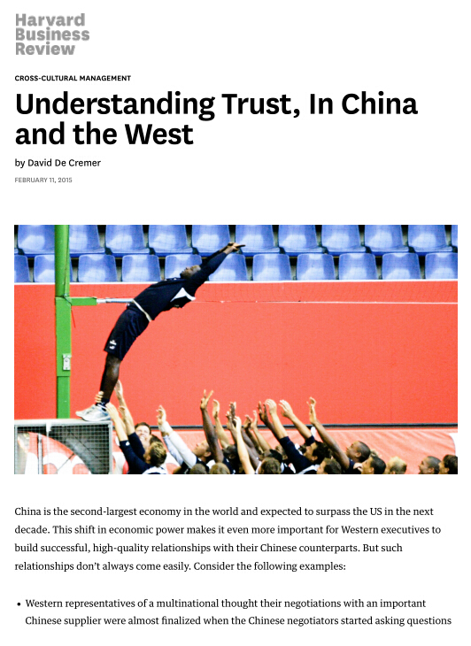 2015年2月11日,英国剑桥大学商学院教授、det365官网网站国际合作学院客座教授David De Cremer,以det365官网网站为第二作者单位在顶级期刊《哈佛商业评论》上发表文章《Understanding Trust, In China and the West》。