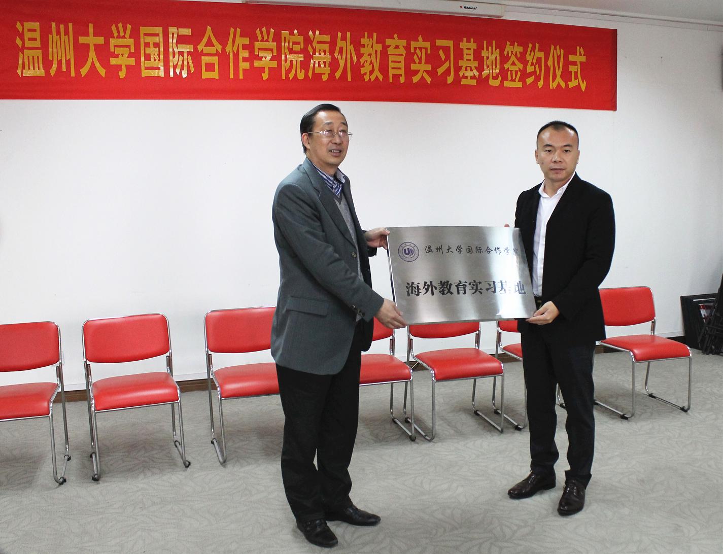 图为严晓鹏院长向阿联酋温州商会张俊毅会长授予海外教育实习基地铜牌