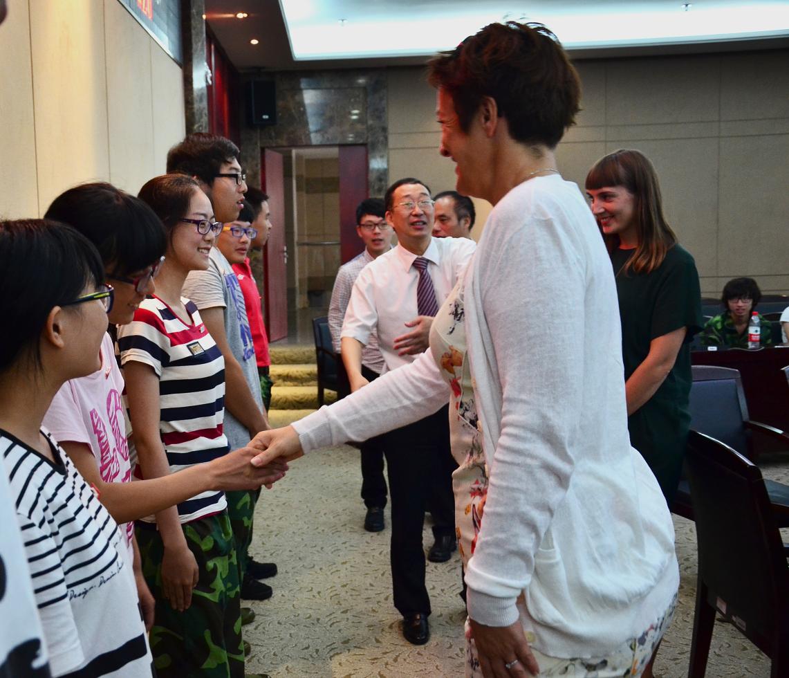 随后,2013级老生代表单静怡、2014级新生代表徐伊文也分别用流利的英语进行了发言。最后,出席典礼的领导和嘉宾为新生代表佩戴了det365官网网站校徽。
