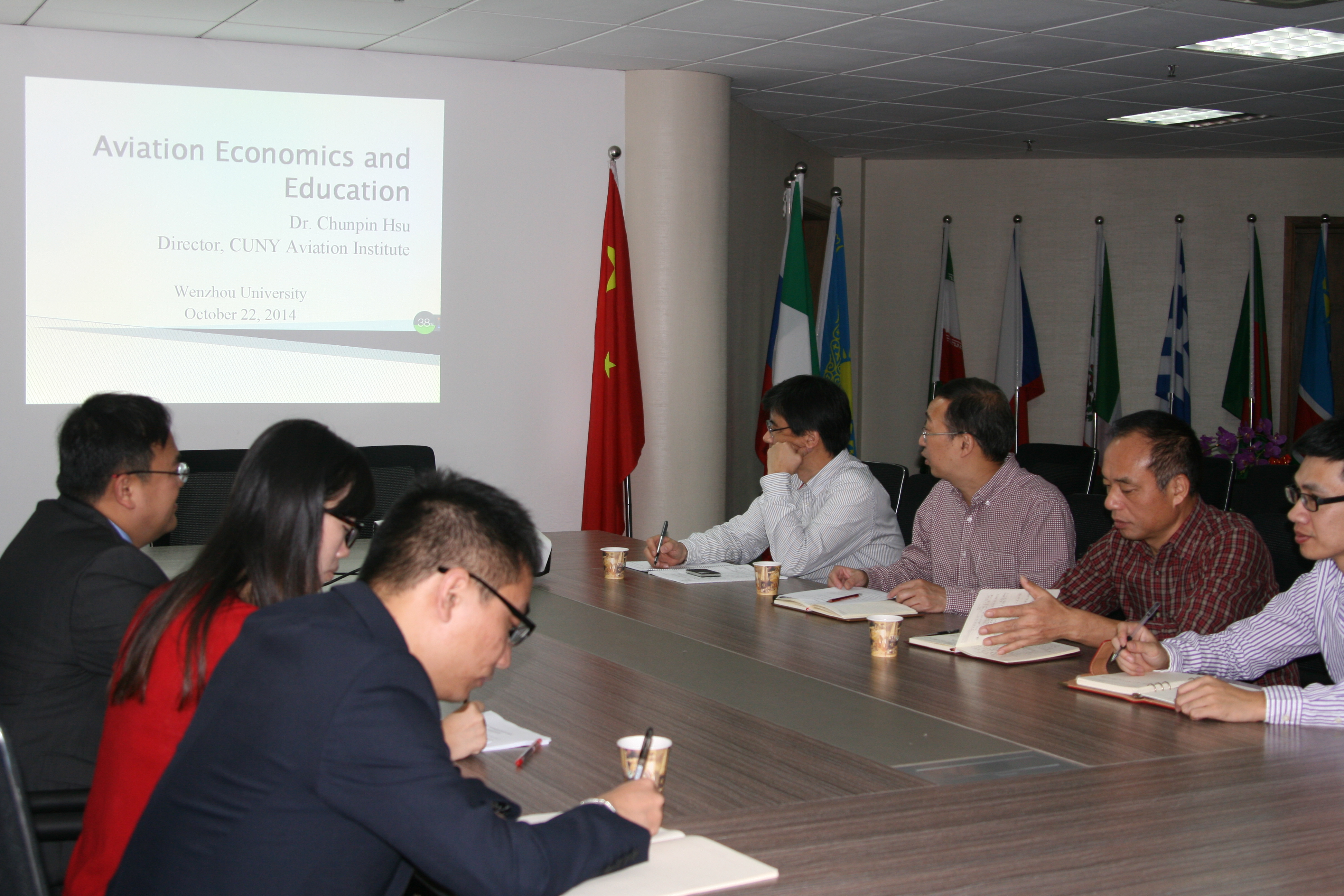 2014年10月22日上午,美国纽约城市大学约克学院(York College, The City University of New York)航空中心主任许竣斌博士莅临det365官网,举行了题为“航空经济与高等教育”的讲座。讲座由国际合作学院院长严晓鹏博士主持,学院党委书记朱建平、副院长陈军及学院、华文教育研究所教师参加。