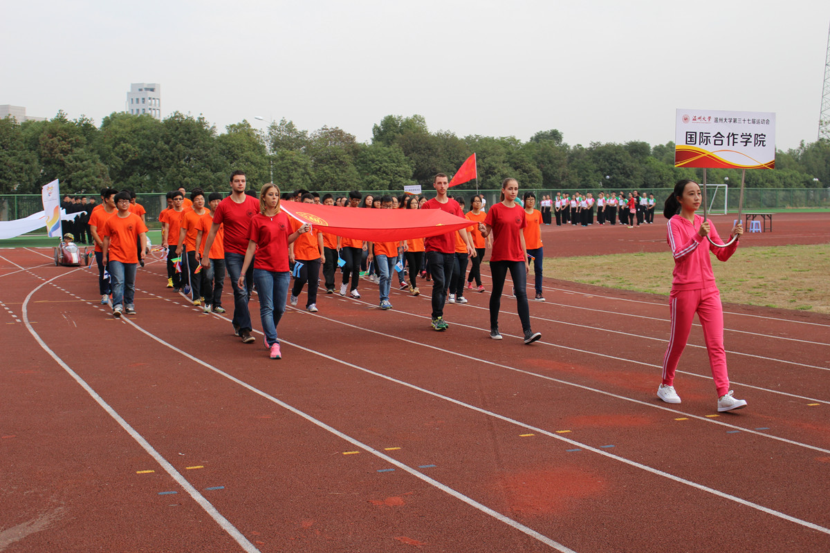 伴着激情洋溢的运动员进行曲,det365官网网站运动会拉开帷幕,国际合作学院的方阵由来自荷兰、意大利、俄罗斯的四位留学生担当旗手,经过主席台时,方阵的同学们迈着整齐的步伐,挥动各国小彩旗,高喊“国合国合、强强联合、国际合作、视野开阔”的口号,充分展示了学院团结拼搏的精神风采和走向国际的办学特色,由此开启了国际合作学院在运动场上精彩的三天。