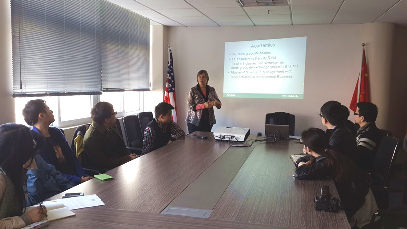 Wendy博士此行的主要目的是与参加库克“3+1”赴美留学项目的学生召开座谈会。她首先简单介绍了库克大学的专业设置、师资力量、配套设施等,并就库克留学事项及奖学金政策做了详细说明。接着, Wendy博士与有意向赴美国库克大学留学的学生就学分转换、课程安排、毕业后留美就业政策等问题进行了面对面的交流,并一一对学生的提问进行详尽细致的回答。通过座谈会,同学们表示对“3+1”项目有更深入详细的了解,对赴美学习有了更充分的准备。